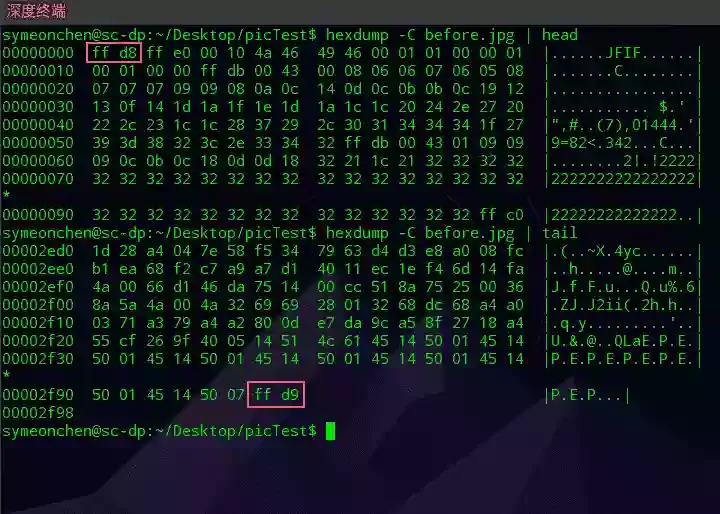 The JPG picture is binary, which uses 0xFF, 0xD8 as the SOI (Start Of Image) of the file, and 0xFF, 0XD9 as the EOI (End Of Image) of the file. See wiki for details on the structure.