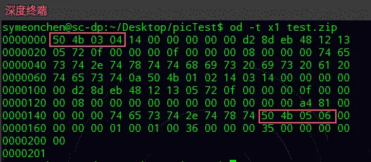 Similarly, we look at the binary value of the zip file. The Local file header Signature and the End of central directory record Signature are 0x504b0304 and 0x504b0506 respectively. For details, see [here](https://users.cs.jmu.edu/buchhofp/ Forensics/formats/pkzip.html)